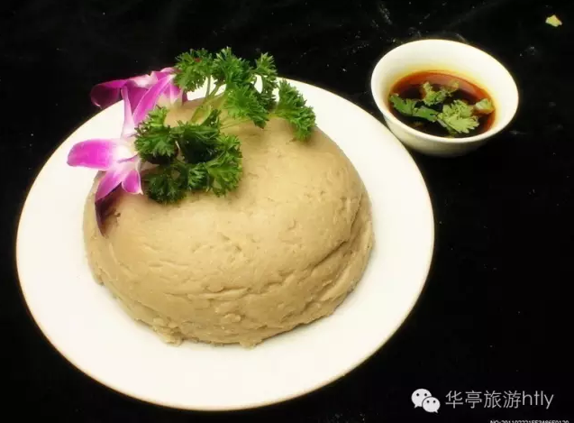 荞面搅团是很普及的陇东农家小吃。加工技术全在一个“搅”字上,俗话说:搅团要好,七十二搅。因为搅的圈数越多,搅团就越筋道。制作时温火、多搅、均匀、粘稠适度。备以蒜泥、辣子油、盐醋等调好的蘸汤。风味特点:搅团色青淡,外凉内热,边蘸边吃,酸辣宜人,兆和气团结之意。