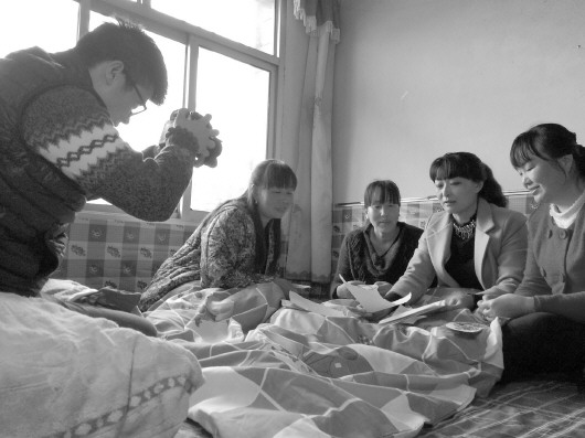 在安口镇武村铺村宝云曲子戏团团长刘宝云家里拍摄她们排练《三娘教子》唱段情景